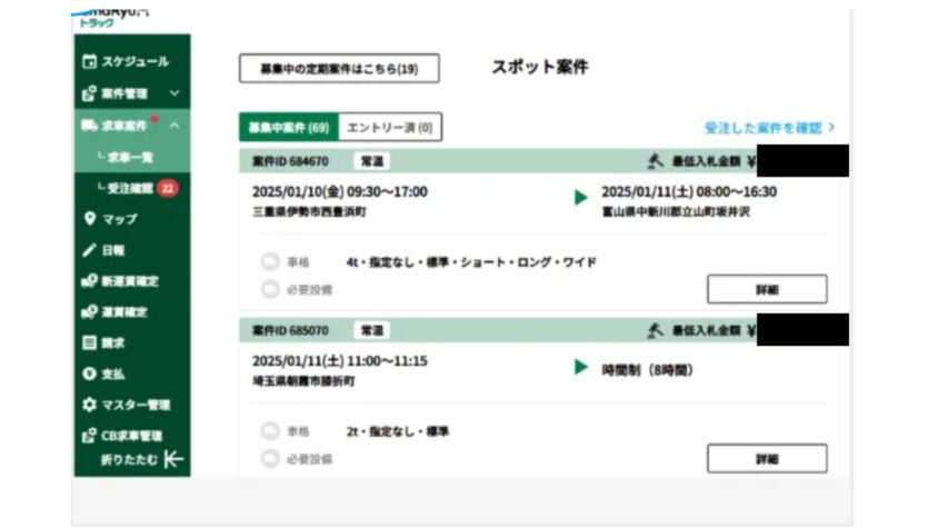 料金も、利用料は無料で、案件は入札制度(運送会社側がいくらでできるか決める)なので、提示金額以下に下がることはないのも安心できます。とはいえ、車が空いているから安く受けてしまう運送会社もあるのも事実です。