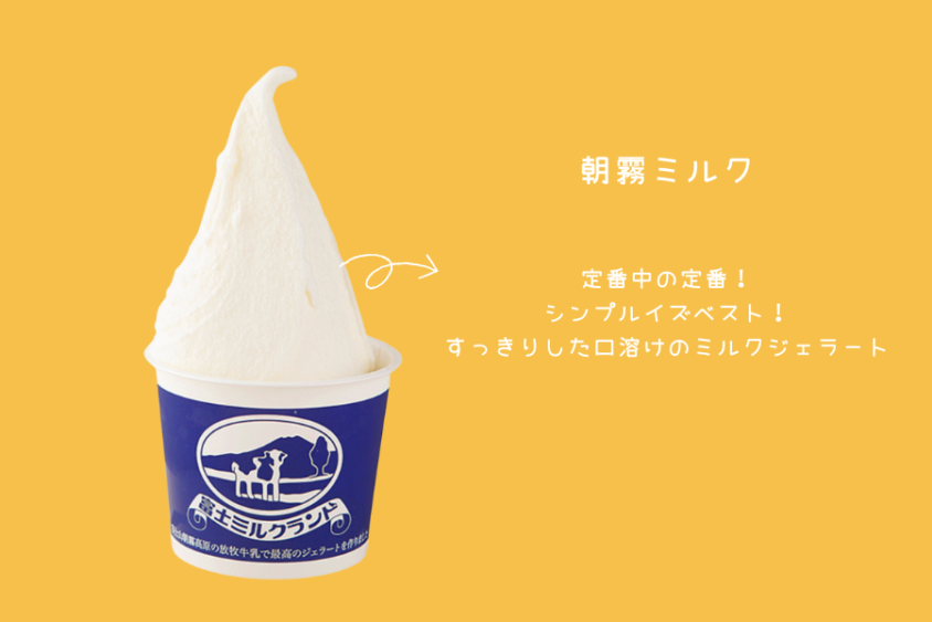 朝霧高原牛乳を使った各種ソフトクリームの中で人気No.1!ジェラートなのでソフトクリームよりさっぱりいただけます。素材の良さを活かした本格派ジェラートです。