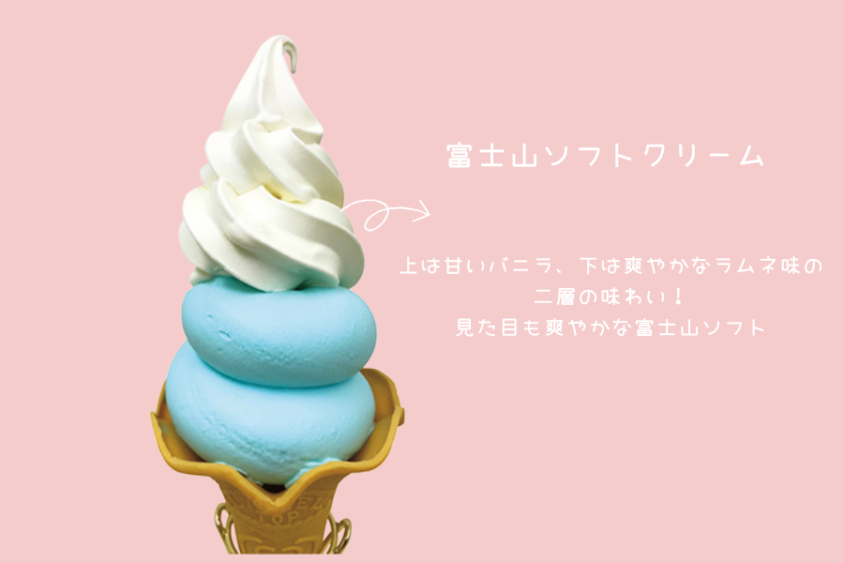 富士川SA(上り)では「富士山ソフト」が看板メニュー。富士山をかたどったソフトクリームは、上は甘いバニラ、下は爽やかなラムネ、2つの味わい。